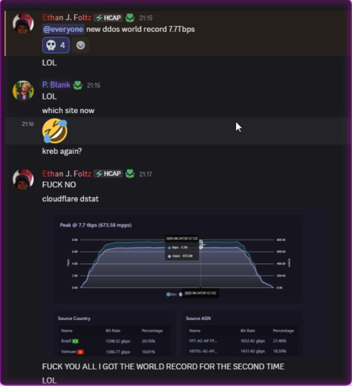 A screenshot shared by XLabs showing the Aisuru botmasters recently celebrating a record-breaking 7.7 Tbps DDoS. The user at the top has adopted the name “Ethan J. Foltz” in a mocking tribute to the alleged Rapper Bot operator who was arrested and charged in August 2025.