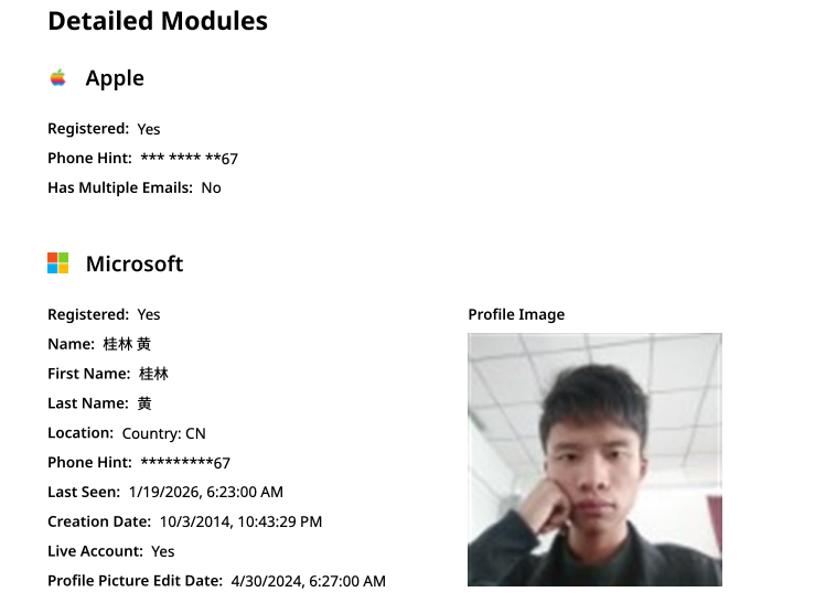 Constella finds 189308024@qq.com is associated with the China phone number 18681627767. The open-source intelligence platform osint.industries reveals this phone number is connected to a Microsoft profile created in 2014 under the name Guilin Huang (桂林 黄). The cyber intelligence platform Spycloud says that phone number was used in 2017 to create an account at the Chinese social media platform Weibo under the username “h_guilin.”